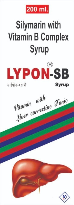 Lypon-SB Syrup contains Silymarin combined with B-Complex vitamins including Thiamine, Riboflavin, Pyridoxine, and Niacinamide.