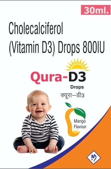 Qura-D3 Drops contain Cholecalciferol (Vitamin D3) 800 IU per ml in a flavoured syrup base.