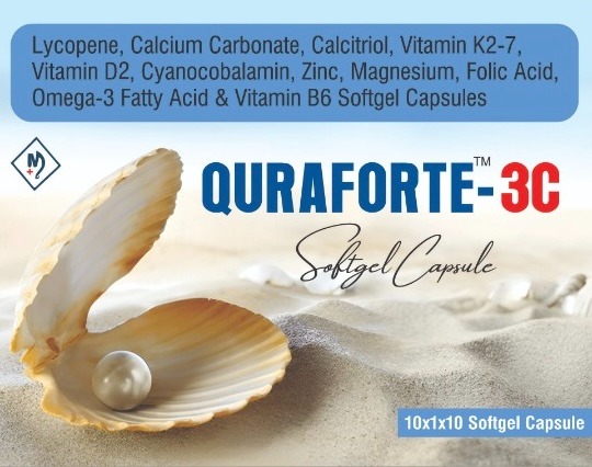 Quraforte-3C is a nutraceutical softgel formulation containing Lycopene, Calcium Carbonate, Calcitriol, Vitamin K2-7, Vitamin D2, Cyanocobalamin, Zinc, Magnesium, Folic Acid, Omega-3 Fatty Acid, and Vitamin B6.